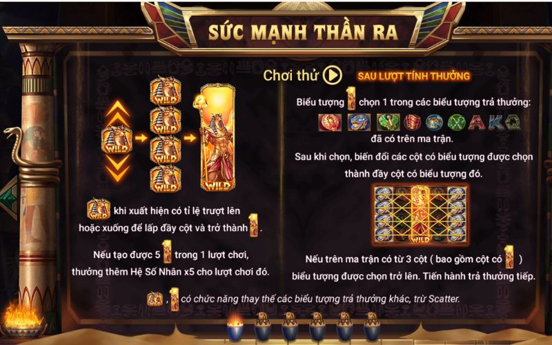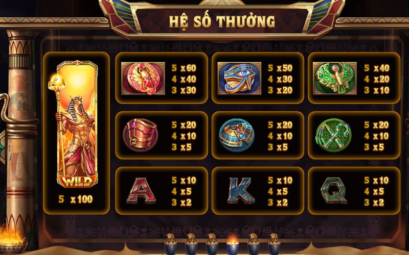 Kim tự tháp là biểu tượng Scatter, mở ra vòng quay miễn phí khi xuất hiện 3 hình trở lên. Biểu tượng Wild có thể thay thế mọi biểu tượng khác để tạo ra chuỗi thắng liên tiếp. Ngoài ra, còn có các biểu tượng cổ vật, mắt thần Horus, bọ hung vàng,… vừa trang trí đẹp mắt vừa tăng tỷ lệ trúng thưởng đều đặn qua mỗi vòng quay.