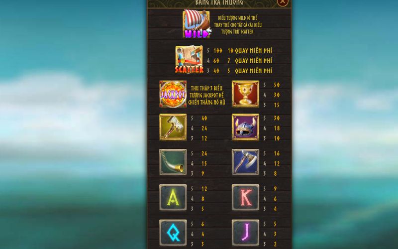 Hệ thống các biểu tượng được thiết kế như một kho báu chiến lợi phẩm, mỗi loại mang trong mình khả năng bùng nổ phần thưởng. Nổi bật nhất là Rương Vàng, biểu tượng có giá trị thưởng cao nhất, khi xuất hiện đủ bộ có thể kích hoạt mức nhân thưởng lên đến 150 lần số cược, biến một vòng quay bình thường thành một cơn mưa tiền không kiểm soát.
